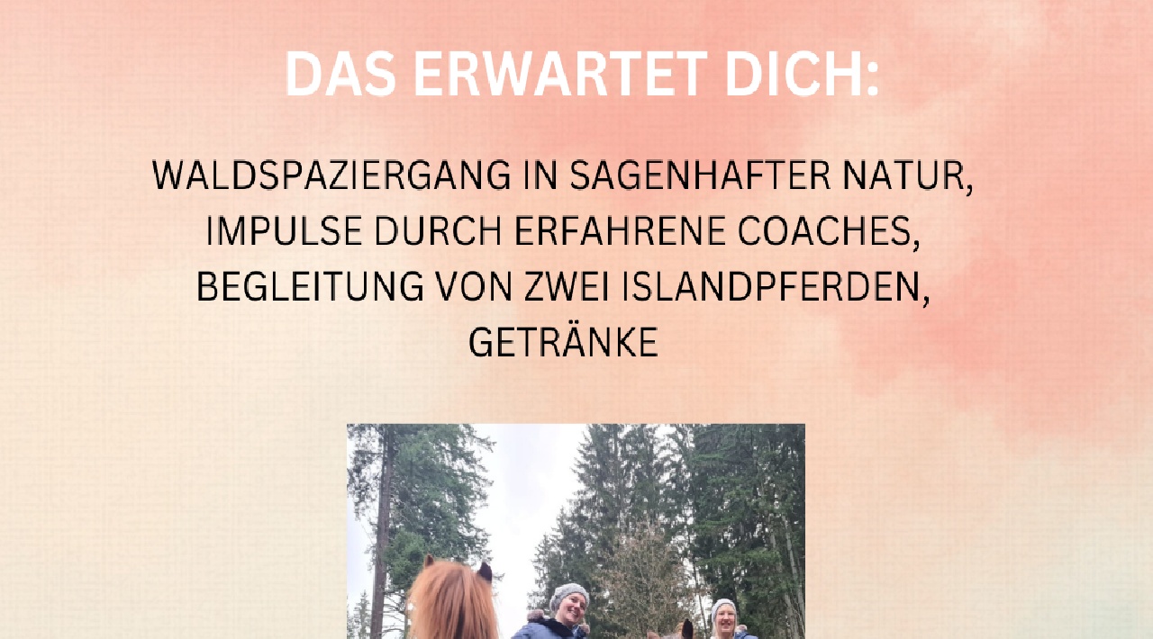 Unser Waldspaziergang mit Pferden bietet eine einzigartige Möglichkeit, in einem Kreis von Frauen Impulse zu erhalten und die sagenhafte Natur zu erleben und die eigenen Stärken (wieder-)zuentdecken. Lasst den Alltagsstress hinter euch und genießt gemeinsam unvergessliche Momente.